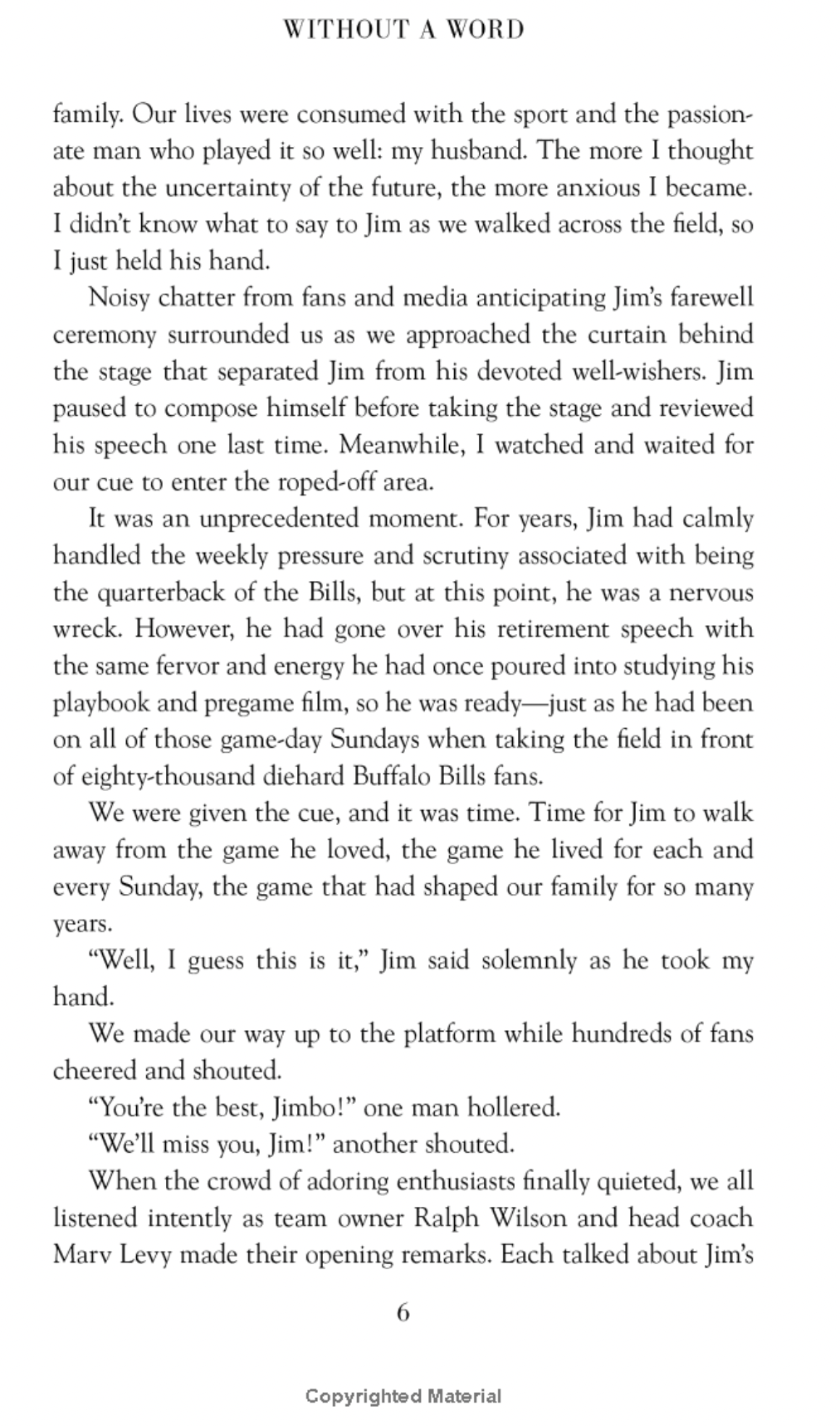 WITHOUT A WORD is a powerful memoir that weaves together remarkable achievement with love, sacrifice, pain, and the enduring strength of the human spirit. It offers an intimate look into the lives of Pro Football Hall of Famer Jim Kelly and his wife, Jill, revealing the private journey of the Kelly family as they navigated eight and a half years caring for their severely disabled, terminally ill son, Hunter. Through Hunter’s brief and silent life, his love illuminated the darkest corners of their hearts, leading Jill to embrace the reality of Jesus Christ, learn forgiveness for past hurts, and inspiring Jim to seek and find God. Filled with lessons of faith, resilience, and redemption, this memoir is both compelling and deeply inspiring, showing how love and hope can transform even the most challenging circumstances.